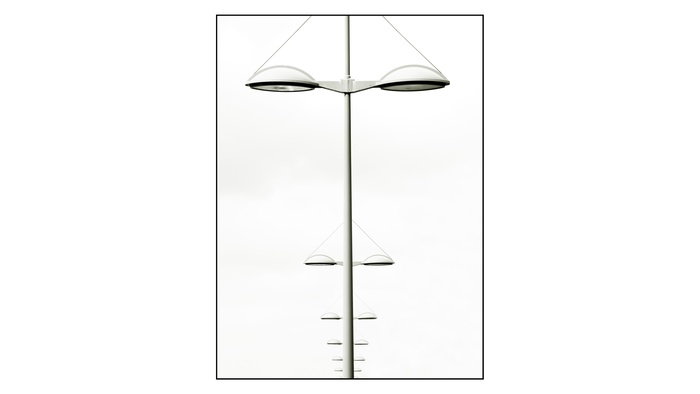 skies with lots of space above and below. Towels on a washing line, symmetrically spaced street lamps and street